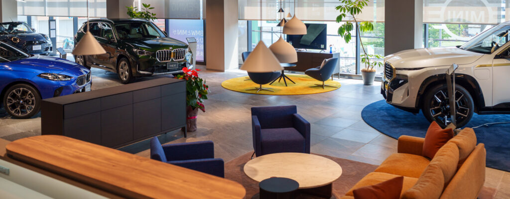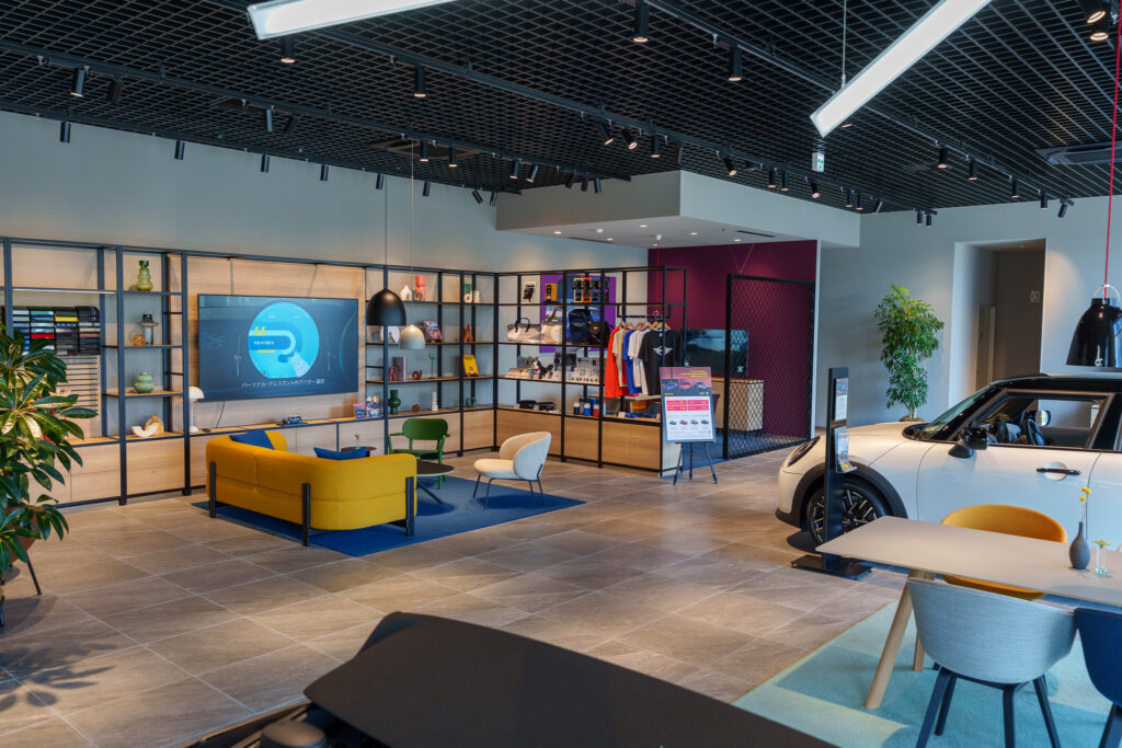従来のショールームと決定的に違うのは、車両と対面するまでの「プロセス」です。機能的なデスクが並ぶ風景は消え、空間を緩やかに仕切るラグや、計算された配置のソファがあなたを迎えます。ブランドの壁を感じさせないシームレスな設計は、BMWの革新性とMINIの遊び心を自由に行き来することを可能にしました。