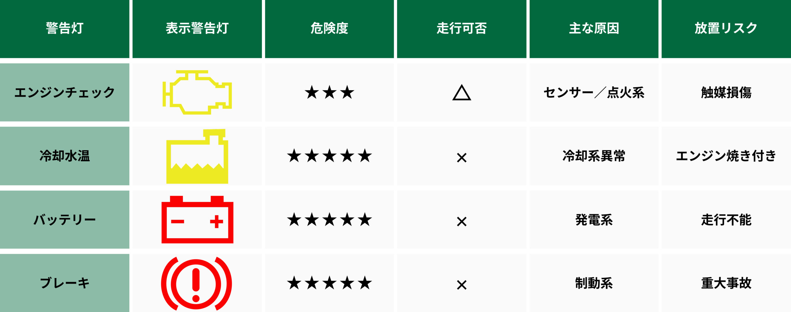 • 警告灯の色・点灯状態ごとの危険度と正しい初動対応